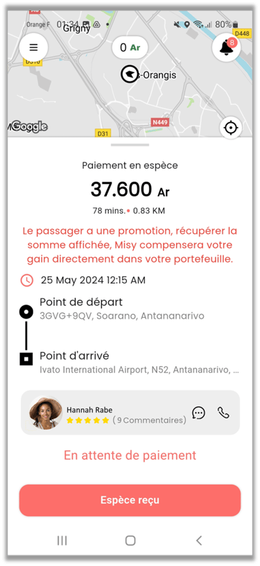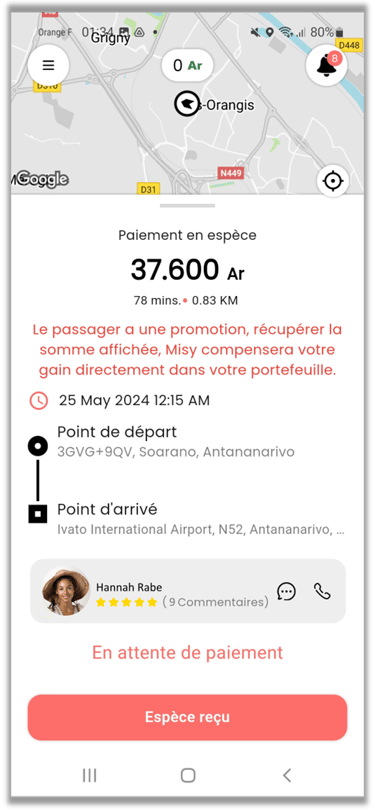 Ce montant inclut la commission et/ou les promotions passager, dans ce cas, Misy créditera votre portefeuille virtuel pour compléter votre revenu.